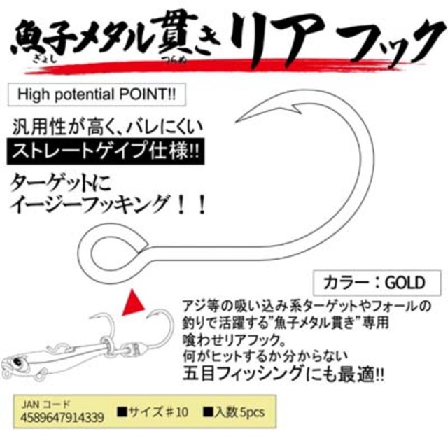 魚子メタル貫き専用の替えフック。吸込み系ターゲットやフォールの釣りに強い「リアフック」。 汎用性が高くバレにくいストレートゲイプ仕様!ターゲットにイージーフッキング! アジ等の吸い込み系ターゲットやフォールの釣りで活躍する"魚子メタル貫き"専用喰わせリアフック。何がヒットするかわからない五目フィッシングにも最適!※ご注文確定後の返品・交換不可のためご注意ください。