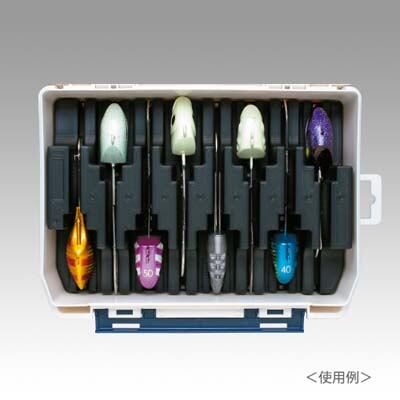 タチウオテンヤ専用ケース。30号〜50号のタチウオテンヤを8個収納可能。縦置きに収納できるので、仕掛けを変える際に取り出し易く、並列に並ぶことで、カラ—やサイズが一目で分かります。