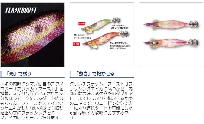 クリンチシリーズが持つ高い動力性能はそのままに、ボディ内部にフラッシュブースト機構を搭載。ダートアクション中はもちろん、フリーフォールやテンションフォール中にも反射板が揺れて、アオリイカを誘います。通常のローテーションに組み込むことで、幅広い展開が可能となります。
