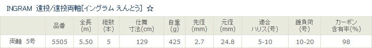 遠投に必要な高い反発力を持ちながら、しなやかで強靭な胴を兼ね備え、強靭なブランクが卓越した遠投性能を誇ります。#2節からベタ付き防止処理塗装を施す事により、ラインのベタ付きを抑え操作性を高めています。磯釣での幅広い状況に対応する実戦能力の高い基本ブランクスはクラス超えの高い遠投力と釣獲力を誇ります。「イングラム 遠投」では、いち早く搭載し実釣時の糸絡みの軽減を実現させました。