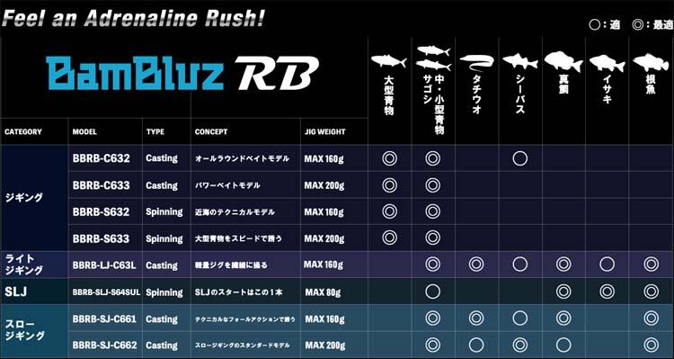 鰤を始めとする大型の青物からイサキや根魚などの中・小型魚まで、ターゲットも多岐に渡るオフショアのジギング。BamBluzRBは幅広いラインナップで旬のターゲットを逃すことなく狙うことができる充実のラインナップです。