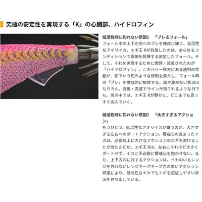 「エギ王 K」は、どんなにタフハイプレッシャーなコンディションでも釣果を出せるよう「低活性イカ攻略モデル」として開発されたエギである。究極の安定性を実現する「K」の心臓部、ハイドロフィンにより、フォール時の「ブレ」を徹底的に排除する。
