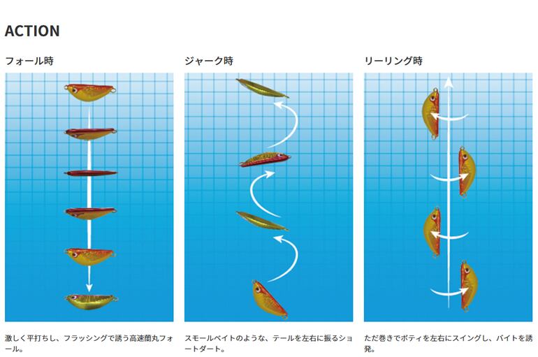 オートメーションで高速落下、喰わせの間、方向転換、平打ちを繰り返し、弱った小魚を演出する。