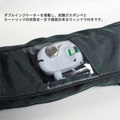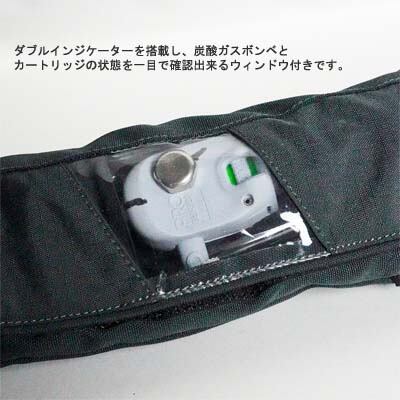 ダブルインジケーターを搭載し、炭酸ガスボンベとカートリッジの状態を一目で確認出来るウィンドウ付き。外装は取り外して洗濯可能。フロントには便利なDリング付き。ベルトは硬めのナイロンベルトを採用。