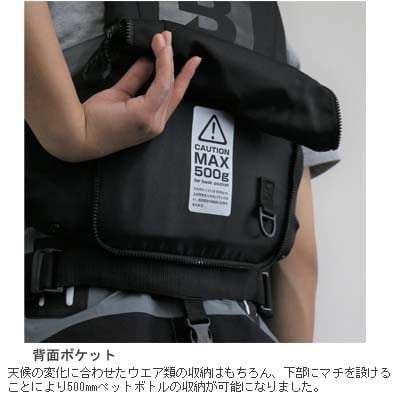 シノビの後継モデル。背面収納を装備。メインポケット上部には、新たにチェストベルトを追加。ベルトを調整することにより、快適なキャスティングが可能になります。リブベルトを25mmから38mmに変更することで、胴衣の強度と着用感が高まりました。