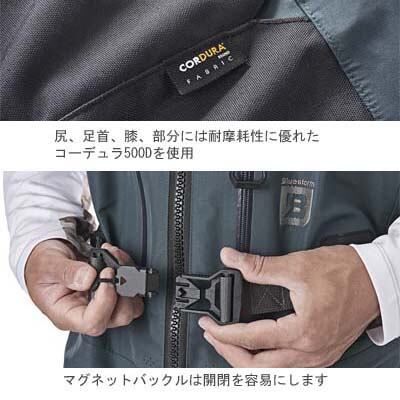 ■生地:SEIREN AQUA MAX/耐水圧: 25,000mm 透湿度: 5,000g/m/24h(A法) SEIREN社製透湿防水生地。多孔質PUコーティングと無孔質フィルムを組み合わせた4層加工による高耐水圧が特徴。