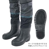 胴周りの生地のダブつきを減らし、アングラーの動きを妨げないようフィールドテストとパターン修正を繰り返しました。ラジアルブーツウェーダーにアップグレードし、サーフでの歩きやすさを考慮したラジアルソールを採用しました。