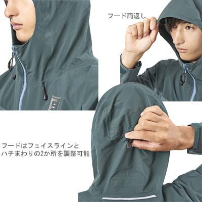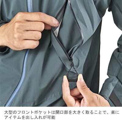 生地裏面には肌にまとわりつきにくい3Dフィルム加工。フードはフェイスラインとハチまわりの2か所を調整することで、荒天時の開口部からの水の侵入を抑える。大型のフロントポケットは開口部を大きく取ることで、楽にアイテムを出し入れが可能。手首まわりにはシリコンプリントの加工を施した、水の侵入を防ぐ現場志向の設計。