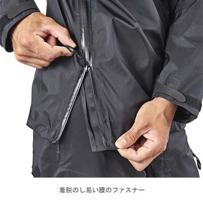 生地全体に適度なハリがあり、エクストリームなシーンでの使用に最適。襟まわりには肌触りが良く吸湿性の高いメッシュ素材を使用することで、荒天時タイトにフィットさせた際のストレスを抑えました。着脱を容易にする首のフラップと腰のファスナーは、シンプルで防水性を損なわないデザイン。