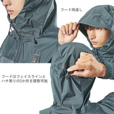 フードはフェイスラインとハチ周りの2か所を調整することで、荒天時の開口部からの水の侵入を抑えます。