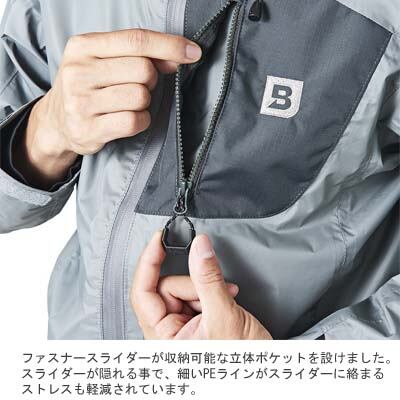 ポンティアスパーカ同様のシームレスホットメルト加工を施すことで水の侵入を防ぎます。