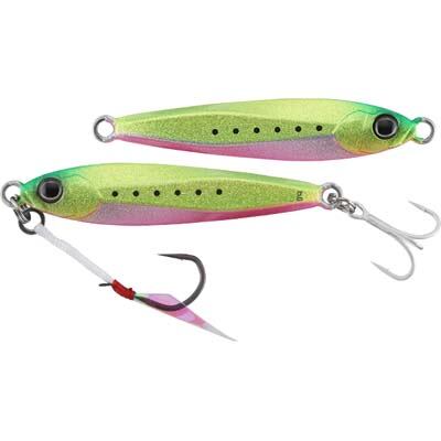 ■ホログラムよりもギラツキを抑えるラメをベースに、沿岸の海水の色に近いライトグリーンを合わせた、水馴染みカラー。ベリーの優しいピンクで適度にアピールしつつもプレッシャーを与えすぎず、晴天時の日中にも口を使わせる「喰わせ特化」のカラーです。