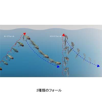 フォール時にラインテンションを少しかけた状態ではカーブフォール、完全にアクションが止まるまでリフトし一気にラインテンションを抜くと不規則にスライドしながらフォールします。