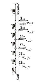 ハリスの長さを3.0cm 2.7cm 2.5cmの3段階とし、水中で3種類の誘いをします。鈎は「フッ素コート」を施し、貫通性能を高めました。