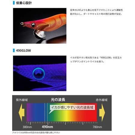 ●490GLOW…イカが見やすい発光色である「490GLOW」の目玉カップがワンポイントでイカを誘う。※ご注文確定後の返品・交換不可のためご注意ください。