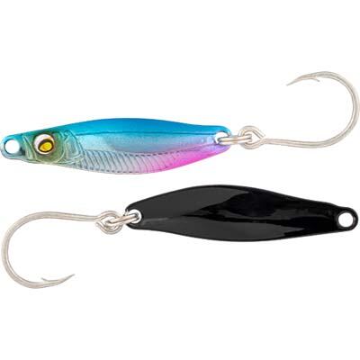 0.6mm厚のステンレス素材を採用した薄いボディは、薄いからこそ出せるキレのある高回転アクションとメッキ処理による激しいフラッシングを発生させ、プラスチックやソフト素材では出せない力強い誘いを可能にします。