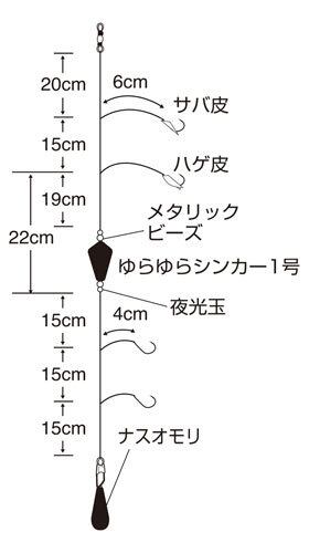 ・鈎:サビキ鈎:小アジ胴打(金)、エサ鈎:キツネ(白)