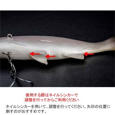 コアを内蔵せず、ボディマテリアルを可能な限り柔らかく設定しています。ゆっくり巻いても適度に頭を振り、まるで糸を結んでいないように泳ぐ「ナチュラルな全身駆動アクション」が特徴です。