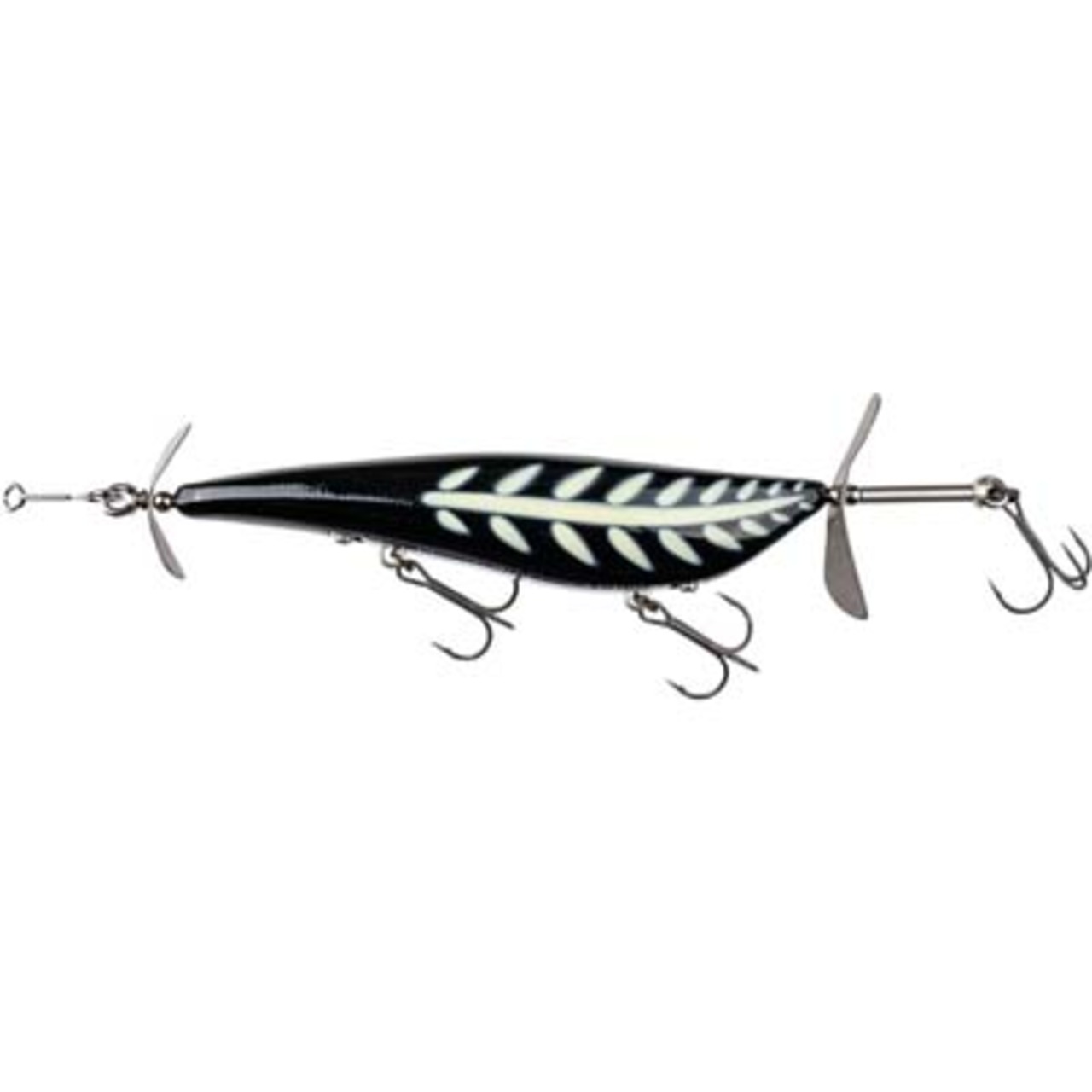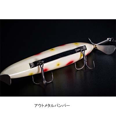 付属の別注カスタムブレードを真ん中のアイにつけることでデッドスローリトリーブ対応モデルに仕様変更が可能です。ヨタヨタとアクションしながらブレードとリアプロップが不規則に接触し金属音を発生させ魚に気付かせます。また、イレギュラーなアクションがバイトトリガーにもなります。