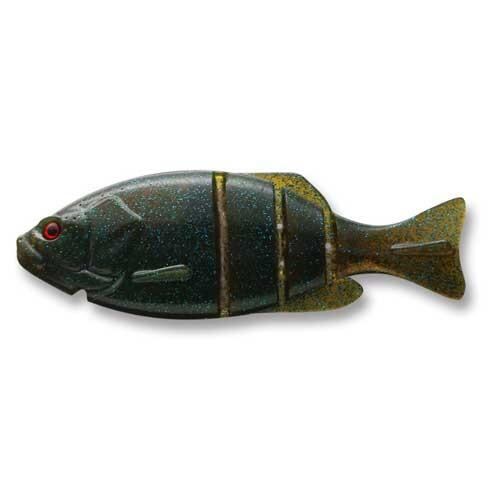 マサウオのブルーギルボディ版スイムベイト。集魚効果のある多関節ビッグボディによるS字アクションや、余韻を残す実物の魚の様なアクションが特徴です。背部の空洞により水に浮く設計で、その穴を細工することにより浮力調整が可能。よりリアルな動きを表現することができます。そのアクションは、使用しているアングラーが本物と見間違えるほどです。専用ロッドは不要。Hクラスのロッドで扱えるマックスサイズにしました。
