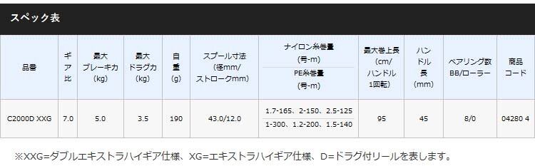 ※XXG=ダブルエキストラハイギア仕様、XG=エキストラハイギア仕様、D=ドラグ付リールを表します。