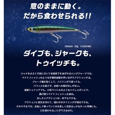【全長】160mm【重量】50g【タイプ】フローティング【フック】#1/0【リング】#6※ご注文確定後の返品・交換不可のためご注意ください。