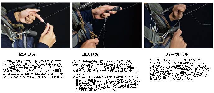 フィールドでノットを組む手間を大幅に減少してくれるアシストツール。摩擦系ノット、特に『FGノット』を組むのに最適です。システムスティックをベストやバックに固定して使用するので、両手がフリーに使え、メインラインにテンションを掛けながら、密な編み込みが可能。フィールドでの使用を考え抜いた、効率的かつシンプルな仕組みに仕上げました。