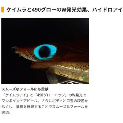 ハイドロボディで安定感のあるフォール、スムーズなダートアクションを実現。ハイドロシンカーはフォール速度の変化で反応が変わることの多い低活性のイカにとても効果的。コンビファインフックはそれぞれ異なった開き角度を持つ段差フックであり、あらゆるタイプのアタリをより確実にフッキングに持ち込むことが可能。