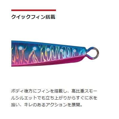 ただ巻きや巻きじゃくりといった極ソフトな誘いも視野に入れタチウオ専用モデルとして開発。定番のワンピッチジャークにも対応すべくセンターバランス形状を採用し、水押しの強い波動とフラッシングアクションも演出可能。フォール時にはサミングの強弱によりタングステン特有のスピードフォールからイレギュラーなスライドフォールまで演出することが可能です。