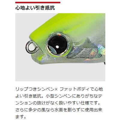 ■心地よい引き抵抗:リップつきシンペン×ファットボディで心地よい引き抵抗。小型シンペンにありがちなテンションの抜けがなく扱いやすい仕様。多少の風なら水面を割らずに使用出来ます。