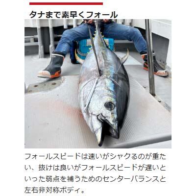 BlueLancer“ブルーランサー”ビンチョウマグロをジギングで狙う、トンボジギング専用設計で船を流して行うドテラ釣法に完全対応したメタルジグです。トンジギに求められる「抜けの良さ」「フォールスピード」を両立。ジャークアクションは首振りスライドアクション、フォールでは垂直スピードフォールとスライドフォールがラインの角度で変化します。