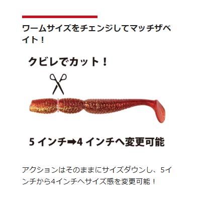 クビレ+前方と後方で形状をアシンメトリーにすることでロールアクションが追加!独特な形状のシャッドテールはロールアクション+強波動を発生させ、ターゲットに猛アピールします。クビレ部分でワームをカットすることで、アクションはそのままにサイズダウンし、5インチから4インチへサイズ感を変更可能!※ご注文確定後の返品・交換不可のためご注意ください。