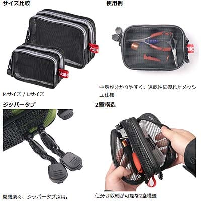 小物収納に便利なサイズ感のメッシュポーチ。2室構造で仕分けて収納が可能。ジッパータブを採用しているので開閉も楽々です。