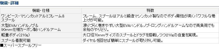 70mmの大口径スプールにギヤー比4.7とハイスペック仕様のイカダリール。こだわりのサミングゾーンも搭載。