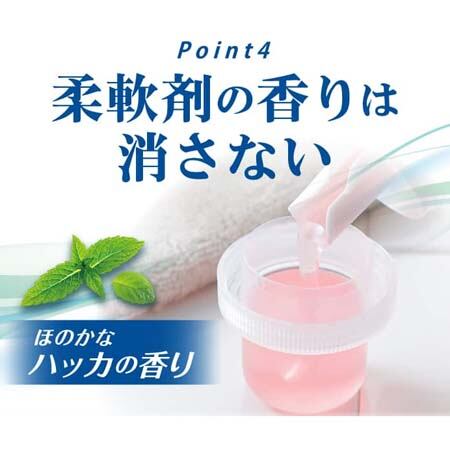 ハッカ精油と抗菌剤がニオイの元の菌の増殖をしっかりと抑え、ニオイの発生を防ぐ。(全ての菌を抗菌するわけではありません。)部屋干し臭・生乾き臭対策・手強いタオル臭にも。