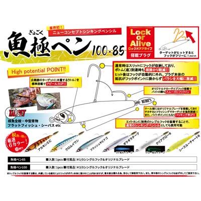 根掛かり回避に特化したシンキングペンシル「魚極ペン」。本体上部に背負わせたストレートフックは魚からのバイトで可動する"Lock or Alive"システムを初搭載! あらゆるフィッシュイーターに効くスペシャルプラグである。