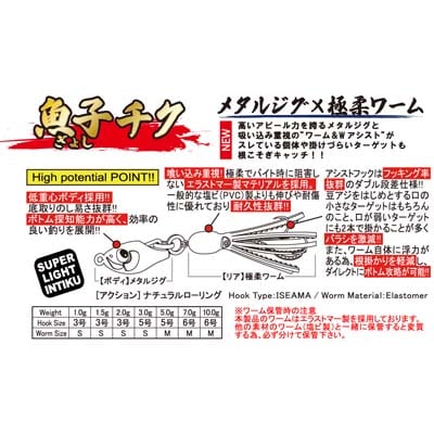 ■アシストフックはフッキング率抜群のダブル段差仕様!豆アジをはじめとする口の小さなターゲットはもちろんのこと、口が弱いターゲットにも2本で掛かることが多くバラシを激減!また、ワーム自体に浮力がある為、根掛かりを軽減し、ダイレクトにボトム攻略が可能!
