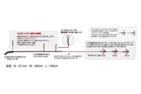 そのバランスは装着後、イカに達するまでの間に道糸を緩めても水平に落ちていきやすく、イカに達すると鈎側がはね上がるよう設計されているため、道糸に絡むトラブルなども少ないのが特徴です。