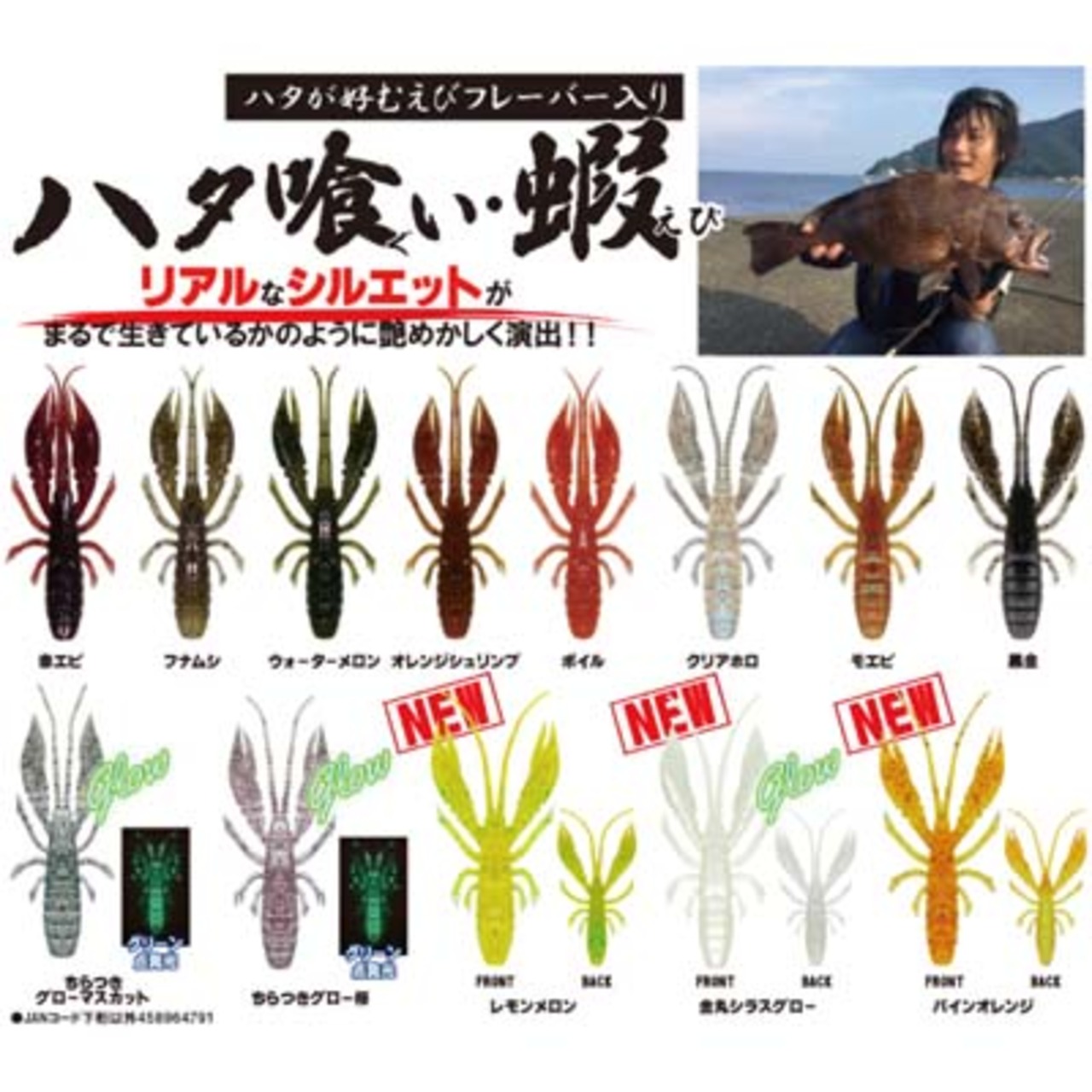 「ハタ喰い・蝦」は、ターゲットが警戒心を抱くことなく、即座にバイトへ繋がるよう、リアルなシルエットを追求、また、まるで生きているかのように艶めかしく演出するよう、爪の根本にはスリットを入れており、アクション、及び、水流の動きに追従するところに重きをおいた。