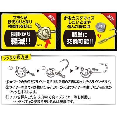 ヘッド部のブラシガードが杖代わりとなり、横倒れをカバーすることで厄介な根掛かりを大幅軽減!フックもイージーロック機構搭載で簡単にカスタムや交換が可能!ボトムを恐れることなく攻めることが出来る進化系ジグヘッドとなっています。ワームには「根魚&チヌ喰い」シリーズを推奨します。