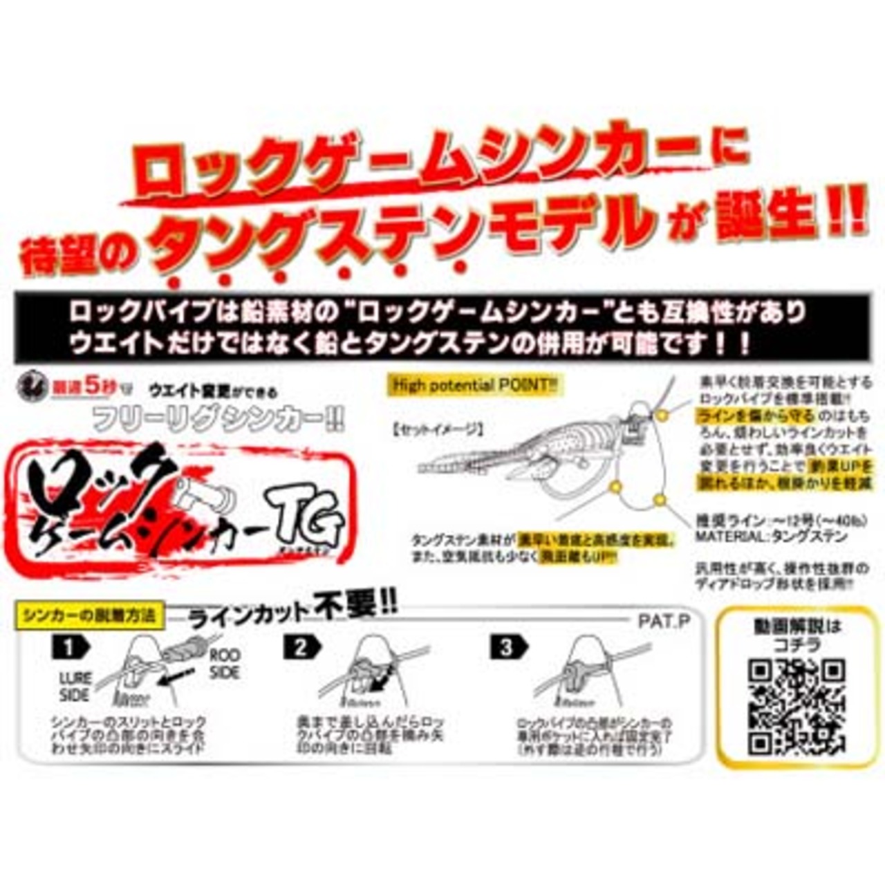 最速5秒でウエイト交換ができる。「ロックゲームシンカー」に待望のTG(タングステン)モデルが遂に登場! 素早く脱着交換を可能とするロックパイプを標準搭載!ラインを傷から守るのはもちろん、煩わしいラインカットを必要とせず、効率良くウエイト変更を行うことで釣果upを図れるほか、根掛かり軽減。