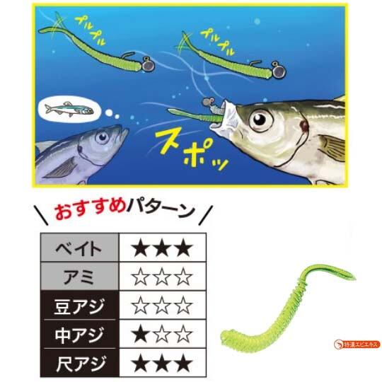 この形状変化は、誘いのアクション後、アジが捕食し易い姿勢を取り、吸い込みの際フックのすぐ後ろまで折れ曲がる様になっている。