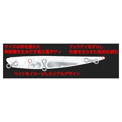 水絡みのよい高比重ボディは、トップウォータープラグにありがちな下からの食い上げによるミスバイトを抑制し、フッキング率を高める。また高速トゥイッチによる誘いにおいても、予測不能なパニックアクションを、誰もが演出することができる。