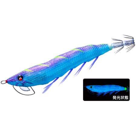 ブルー夜光ボディ。ブルー系をベースにパープルバック搭載。海に馴染むカラーリングはスレイカに効果を示し、グリーンの杉模様とのコントラストはエギの存在を知らせる。