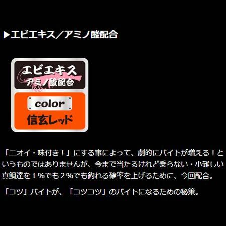 ●エビエキス/アミノ酸配合…「ニオイ・味付き!」にする事によって、劇的にバイトが増える!というものではありませんが、今まで当たるけれど乗らない・小難しい真鯛達を1%でも2%でも釣れる確率を上げるために、今回配合。「コツ」バイトが、「コツコツ」のバイトになるための秘策。