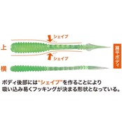 ボディの途中からテールに向かって細くなり、ボディ後部にはシェイプを作ることにより、よく曲がる様になっている。この形状によりアジが吸い込みやすく、フッキングが抜群に決まりやすい。さらに、テール部サイドの小さなフィンは、動かしたい時には動き、喰わせのステイ時には止まるアクションも!