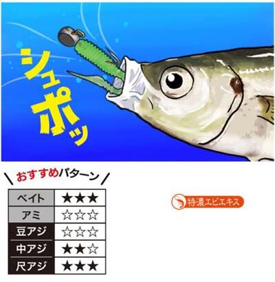 ボディの途中からテールに向かって細くなり、ボディ後部にはシェイプを作ることにより、よく曲がる様になっている。この形状によりアジが吸い込みやすく、フッキングが抜群に決まりやすい。さらに、テール部サイドの小さなフィンは、動かしたい時には動き、喰わせのステイ時には止まるアクションも!