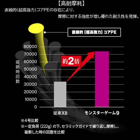 ●高耐摩耗…直線的(超高強力)コアPEの存在により、摩擦に対する強度が増し優れた耐久性を発揮。