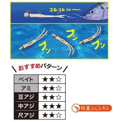 扁平ボディのツインテール形状。一見かなりアピールが強く見えると思うが、リトリーブ中はピタッとくっ付き、ツインテールならではの微波動アピール!さらにフォール中や止めた時には二本が離れてアピールもしてくれる。また、ツインテール形状のため、吸い込みも良く、アタルけど乗らない!そんな状況の時も活躍してくれる。濁りが強い時やアジの活性が高い時、大量のアジがいるのにアタリが遠いシチュエーションなど、様々なシチュエーションに対応!強めなロッドワークでは左右にスイングする様なアクションも演出できるので、喰わせのナチュラルから魅せるハイアピールまで対応可能なオールラウンドモデルとなっている。