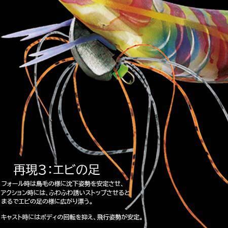 ●エビの足…フォール時は鳥毛の様に沈下姿勢を安定させ、アクション時には、ふわふわ誘いストップさせるとまるでエビの足の様に広がり漂う。キャスト時にはボディの回転を抑え飛行姿勢が安定。